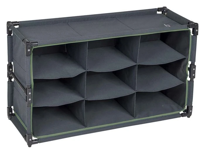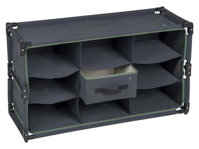 Vos chaussures traînent-elles toujours dans la tente ou l’auvent ? Ou bien vous cherchez simplement une armoire avec de nombreux compartiments de rangement ? L’armoire/organiseur Bo-Camp peut parfaitement être utilisé comme armoire à chaussures mais peut également être complétée par des tiroirs. Ces tiroirs peuvent être commandés séparément et ne sont pas livrés en standard avec l’armoire.