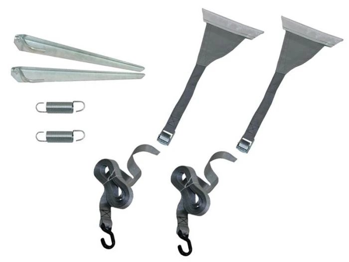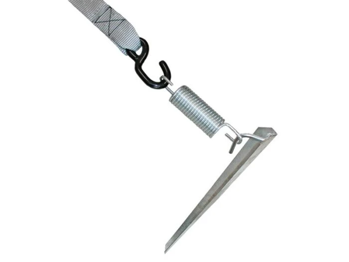 Les sardines fournies permettent d’ancrer fermement les sangles anti-tempête dans le sol. Placez les ressorts entre la sangle anti-tempête et la sardine pour amortir les coups de vent et éviter d’endommager la solette ou la sangle anti-tempête.