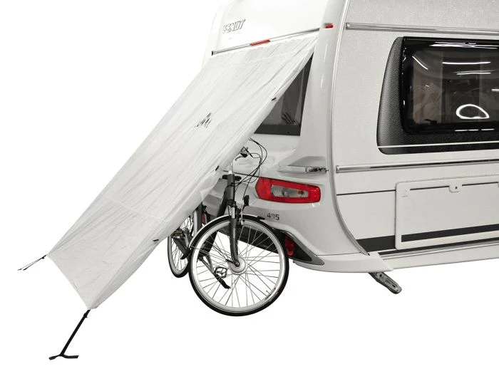 Le montage de cette tente d’appoint est très facile, vous tirez le jonc qui se trouve au-dessus de la toile à travers le rail approprié de votre caravane. Il ne vous reste plus qu’à fixer les élastiques aux quatre coins et le Bike Roof est prêt pour protéger votre équipement de camping.