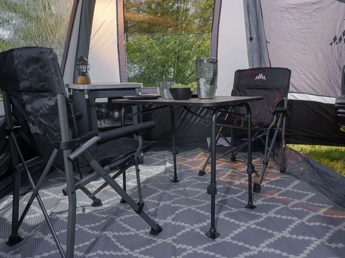 L’armoire Liverpool Luxe a un cadre léger en aluminium avec un tissu en polyester. Le plateau et les étagères sont fabriqués en MDF et pourvus d’un bord en aluminium. L’armoire est équipée de quatre pieds réglables afin que vous puissiez toujours la mettre à niveau sur une surface inégale. Une fois les vacances terminées, vous pouvez facilement démonter l’armoire et la ranger dans le sac de rangement inclus.