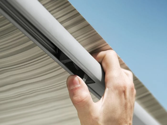 Vous n’avez pas besoin d’adaptateurs pour un store étui. Ceux-ci s’insèrent directement dans le rail de la caravane avec une fixation par jonc.