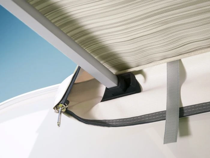 Vous n’avez pas besoin d’adaptateurs pour un store étui. Ceux-ci s’insèrent directement dans le rail de la caravane avec une fixation par jonc.
