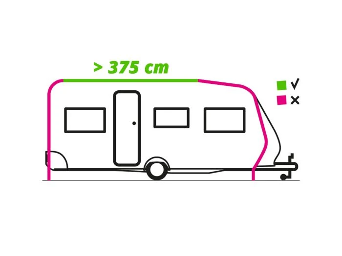 Le Thule Omnistor 1200 convient seulement dans la partie droite (horizontale) du rail de votre caravane. C’est pourquoi il faut toujours mesurer à l’avance la longueur exacte de cette partie du rail. Si, par exemple, vous avez un rail de caravane droit de 410 cm, alors l’Omnistor 1200 d’une longueur de 400 cm convient parfaitement.
